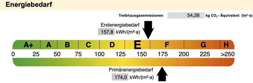 - Energieverbrauch: 157,8 kWh/(m²·a) | Effizienzklasse E